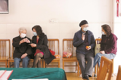 图为庄老伯和女儿(右一)在凉城新村敬老院开心聊天,探望地点安排在一楼大堂。记者 蒋迪雯 摄