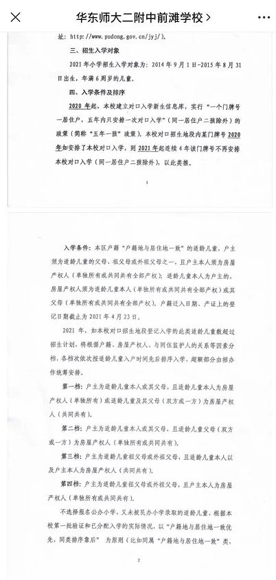 上海家长:手握两套学区房,恐怕全部“踏空” 公办学校学区房,向来是上海家长们购置房产时的优先选择,尤其是义务教育阶段的“公民同招”(所谓“公民同招”,是指义务教育阶段公办和民办学校同步报名、同步招生、同步注册学籍,不得提前组织招生。)“民办摇号”的新政出台后,早日购入学区房“占领”户籍“坑位”成为了许多家长的投资理念。 有数据显示,2020年上海二手房的成交量上涨了31%,学区房上涨了37%,双学区房则涨了44%。 华二前滩可以说是家长关注前滩楼盘最重要的理由之一。 华二前滩2018年开始招生,自2020年起实行了一个门牌号一居住户、五年内只安排一次对口入学(同一居住户二孩除外)的政策,被简称为“五年一孩”政策。 3月25日,华二前滩在其官方公众号上发布了2021年招生告示,将招生政策进一步收紧。与以往最大的区别就是在“人户一致”中分了4个档,其中第一档要求:“户主为适龄儿童本人或其父母,且适龄儿童本人为房屋产权人(单独所有)或适龄儿童及其父母(双方或一方)为房屋产权人(共同共有)。” 通俗而言,就是房产证有儿童名字的,被列为入学第一梯队,且“产证登记日期截止时间为2021年4月23日。” “孩子名字上产证,这可是一笔很大的成本,但不上产证,万一因为被列入第二档,进不去学校,当初房子就白买了,这简直了。”前滩业主吴先生看到招生公告后说道。 二胎家庭刘女士告诉《中国经济周刊》记者,她大宝已经读高中,好几年前买前滩房子的时候,主要是考虑各方面配置比较宜居,当时上海教育还没有“公民同招”的政策。 刘女士回顾说:“我当时打算二宝去考民办,拿公办学区做保底。后来‘公民同招’政策出台,我比较了自己所有的房产,将前滩华二当成首选,不想冒险‘摇’民办。当时办好产证,我就把孩子的户口第一时间迁入,产证上是我和老公的名字。浦东入学政策一直以来都是人户一致且父母是产权人、户主,这是第一档。现在华二前滩这个招生政策出来,我很可能被其他后来买的业主挤掉名额,但再迁回另外的房产已经来不及(二宝明年就要入学),等于说我两边学区房都要踏空。” “如果教育部门保证,迁回原来的户籍地可以入学,我分分钟迁回去,不来趟这浑水,原户籍地入学政策没有要求未成年人上房产证这样的规则,只要看入户年限。”刘女士告诉记者。 同样为前滩学区房苦恼的宋女士说:“加上二宝名字还有个问题。我咨询得到的信息是,加大宝名字的话,原则上还要得到二宝的同意。涉及到共同共有还是按份共有,一旦牵涉权益更麻烦。” 胡先生刚刚新婚,将前滩的这处新房作为婚房。他告诉记者:“我们家4位老人倾其所有帮我付了首付。如果我生了孩子,上了户口,也没有能力立刻还掉贷款加孩子名字,而以后如果有实力全款购买二手房的家庭,直接将孩子写上房产证,不产生税费,可以‘弯道’赶超我的孩子就读名校,这是有失公允的。” 前滩区域部分家长认为,若切实存在教育资源紧缺的问题,教育部门和学校应该加大投入,增加学校资源。 学区入学供需矛盾显现 华二前滩官网显示:“全校现有教职工72人,其中一线教师62人,二线教师10人;小学生在校数434人,初中生在校数239人,学生总数673人。学校占地面积2.86万平方米、建筑面积5.42万平方米。” 据华二前滩2021年招生告示,今年计划招收一年级新生5个班级。 如以每个班45人计算,只有225个招生名额。 那么等待着入学的孩子有多少个呢?据《中国经济周刊》记者结合业主提供的资料初步梳理统计,目前前滩板块已划入学区约为4000多户,截至华二前滩发布新政之日,已交房且人户一致的小区户数约为3000多户。 “如果后面810户明年再划进学区,那就是影响约5000户家庭,”有家长这样说,“据我了解,未来还有千套待售房源。” “提示:根据户籍信息摸底统计,今年本校对口招生地段内户籍适龄儿童人数已超过学校招生计划数。”华二前滩招生告示中称。 中原地产资深市场分析师卢文曦对《中国经济周刊》记者说:“根据以往情况判断, ‘学区房’对应的学校都有承受上限,比如一个学校每个年级只能承载150个学生。学校会根据街道里情况进行排摸和调整,如果片区内学生数量变动不大,按原先政策可以容纳那么多学生,那么政策可能就不调整了。但是短期片区内有大量房屋买卖,迁入大量学生,超过了其承受能力,那么招生政策会做调整。” 有业主对《中国经济周刊》记者说:“我们问学校,第二档父母产证的难道因为你们政策变化,我们就要还几百万贷款,花几十万税费么?学校回复:‘学校没让你们去加名字啊’。” 专家:警惕投资学区房风险 北京炜衡(上海)律师事务所合伙人鞠秦仪律师分析认为,相关政府部门依职权调整辖区内入学政策本身无可厚非,但像“学区房”这种政策牵一发而动全身,本身即属于影响诸多人重大利益的事项,还是要采取审慎的态度,在决策程序上广泛听取意见,尊重和保护民众的“信赖利益”,尽力保持政策的稳定性和长期性,避免落入“朝令夕改”的窠臼,给民众带来“不安”。即使政策不得不改,也要尽量按照“老人老办法、新人新办法”的原则,做好相应前后衔接的工作安排。 卢文曦对《中国经济周刊》记者分析说,投资学区房存在风险,因为买家无法确定自己能否划分在对口学校内。划出对口范围也很正常。更何况最