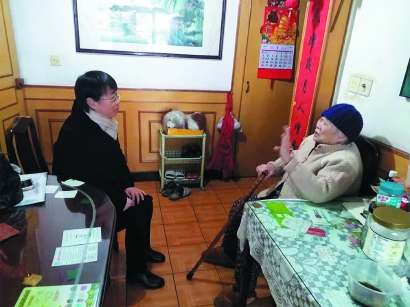 咨询师黄燕(右)在彭浦新村心理服务站给老人心理按摩 本版摄影 向东才
