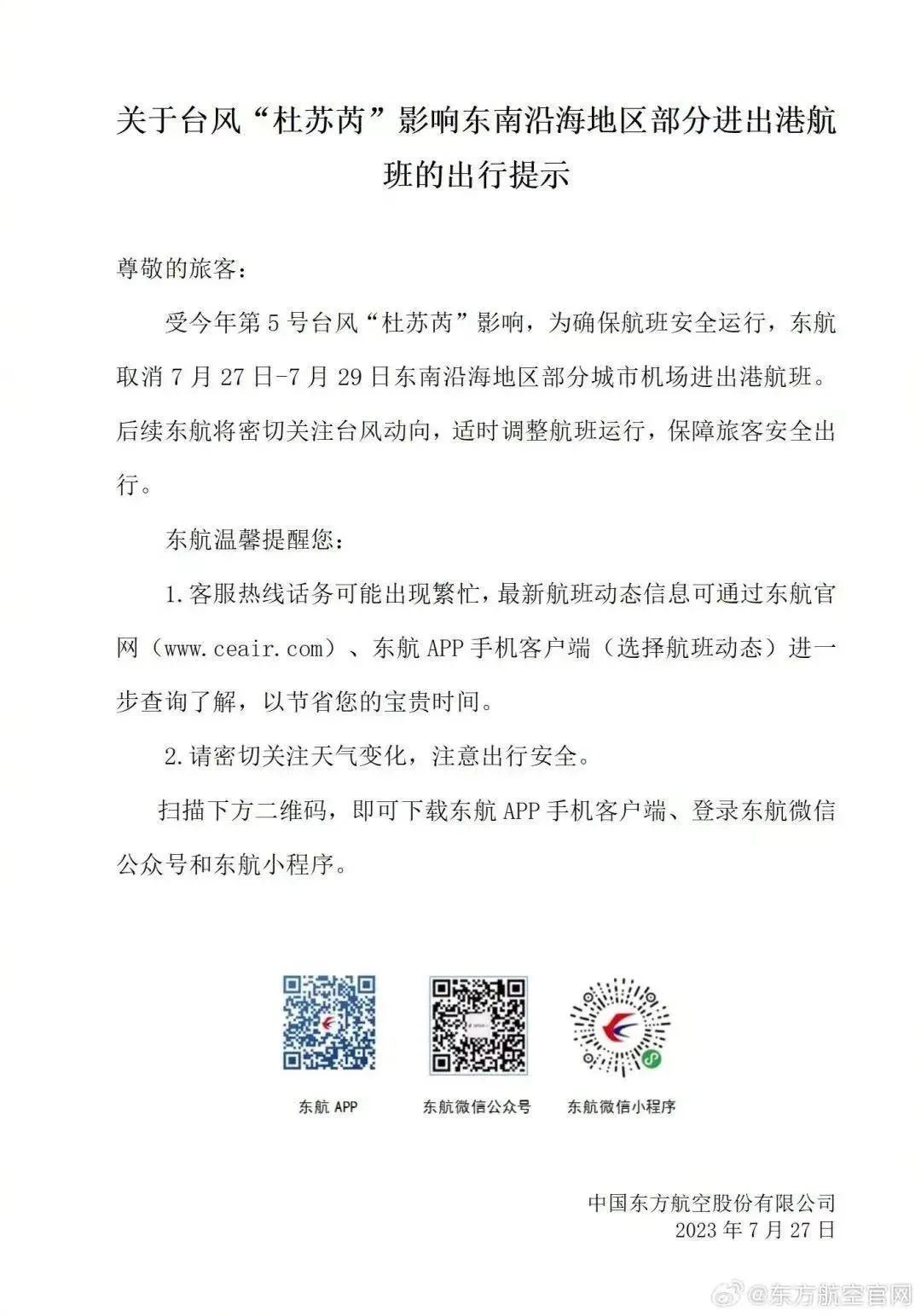 中国东方航空官网 发布出行提示 东航取消了27-29日东南沿海部分城市进出港航班。