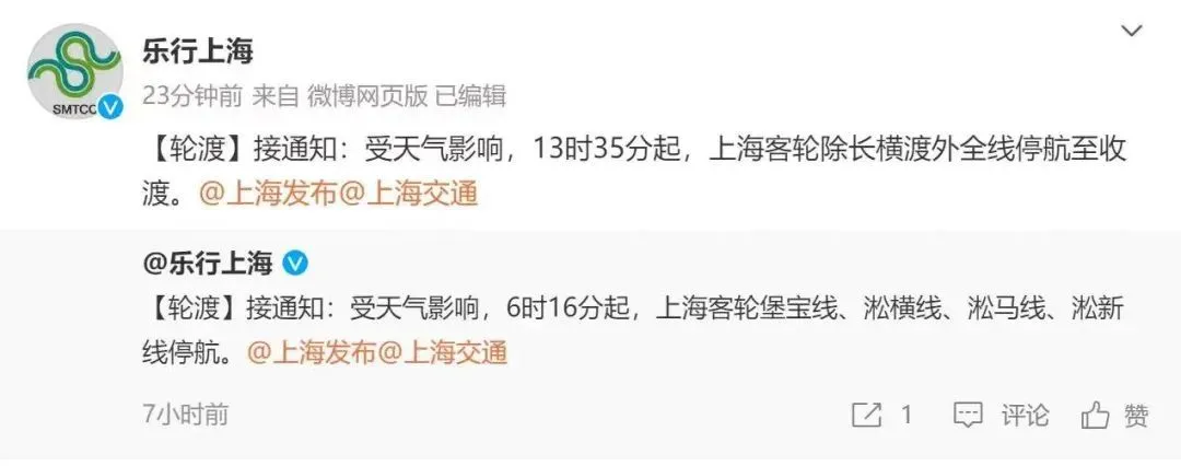 上海客轮停航通知 13时35分起,上海客轮除长横渡外全线停航至收渡。