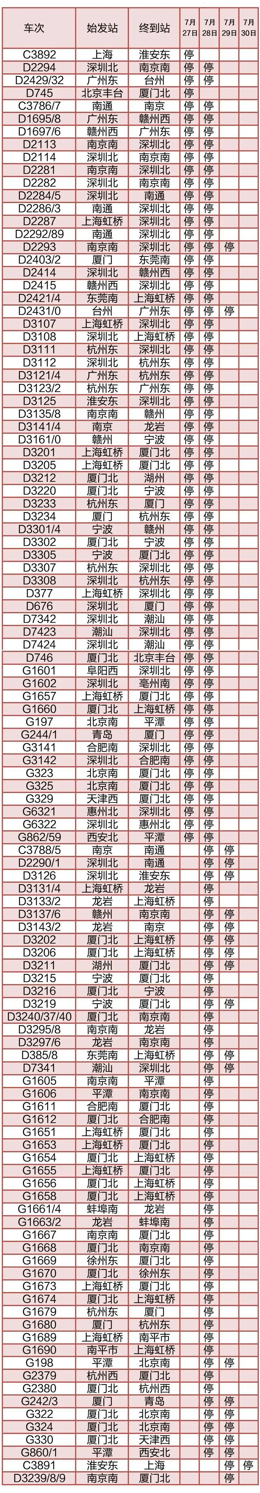 7月26日,福建厦门,渔船停靠在高崎闽台中心渔港躲避台风。 今天8时,泉州启动防台风Ⅰ级应急响应。27日18时至29日12时,泉州全市实行“三停一休”,即停工(业)、停产、停课、休市。 今天8时,宁德市防指决定提升防台风应急响应为Ⅱ级、暴雨应急响应为Ⅲ级。 ■ 广东 今天13时起,广东汕头市将防台风应急响应提升为Ⅰ级,并在全市范围内实行“五停”:除承担抢险救灾和保障社会基本运行任务的单位和个人外,全市其他单位和个人执行“五停”措施(即停课、停工、停产、停运、停业)。预计防台风Ⅰ级应急响应28日24时结束后解除“五停”。 此外,今天17时起,汕头全市公交停运,南澳大桥、连接东海岸大道的新津大桥、东海岸大桥、莱芜大桥实施交通管制。海湾大桥、礐石大桥根据省主管部门指令适时实施交通管制。 ■ 浙江 浙江省自然资源厅与省气象局8时联合发布未来24小时地质灾害风险等级预报,温州市(鹿城区、瓯海区、永嘉县、平阳县、苍南县、文成县、泰顺县、瑞安市、乐清市)、丽水市(青田县)等部分地区地质灾害气象风险很高(红色预警)。 今天上午10时,浙江决定启动地质灾害Ⅳ级应急响应。 今起长三角铁路部分列车停运 据中国铁路上海局集团有限公司消息,今天起,长三角铁路部分列车停运(截至7月26日22时部分停运列车车次信息见附表)。 铁路部门提醒已购买停运列车车票的旅客,可于票面乘车日期起30日内(含当日)在互联网办理退票,或持购票时所使用的有效身份证件原件到车站退票(已打印报销凭证的请将凭证交予车站窗口工作人员),以上均不收取手续费。 滑动查看详情↓