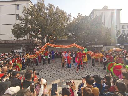 青溪老街照壁前的民俗表演吸引了众多市民游客。 青村镇供图