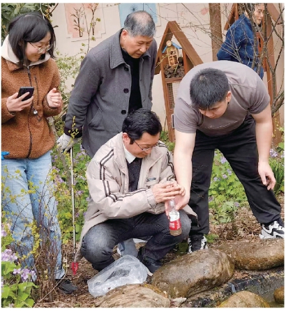 长宁区仙霞街道虹旭居民区,社区干部和居民在生境花园内工作。资料图片
