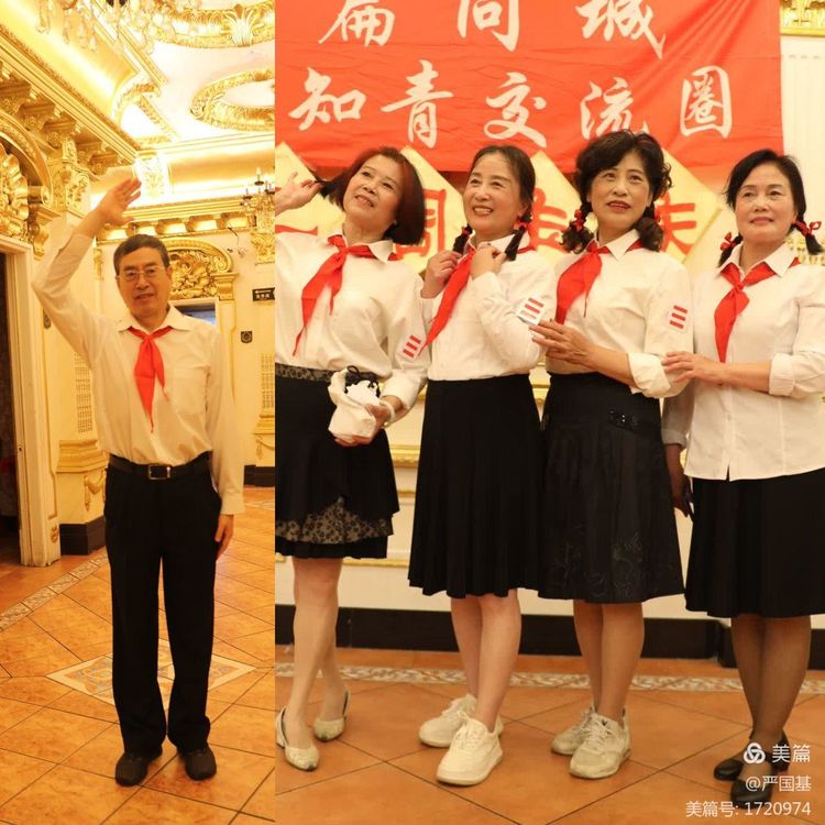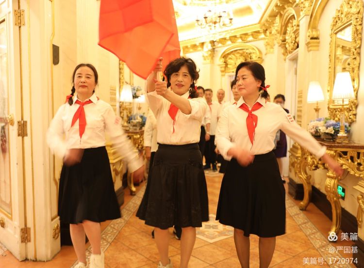 男士们精神抖擞,白衬衣、蓝长裤,女士们精神焕发,穿着白衬衣、黑裙子,这是他们年少时节日的标配。他们的胸前,都佩戴着红领巾,有的还佩带队长标誌和举着队旗,今天他们穿越到年少的时期,怀念天真烂漫的年代。