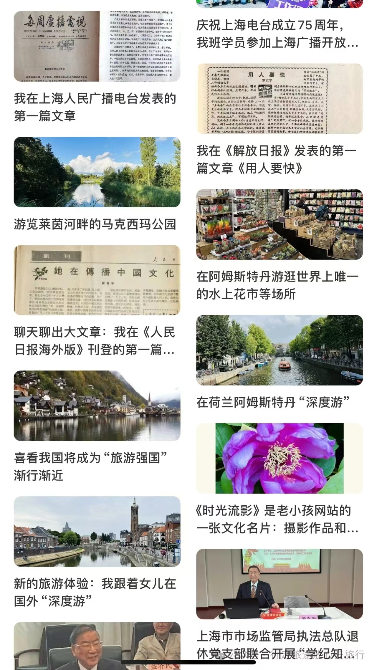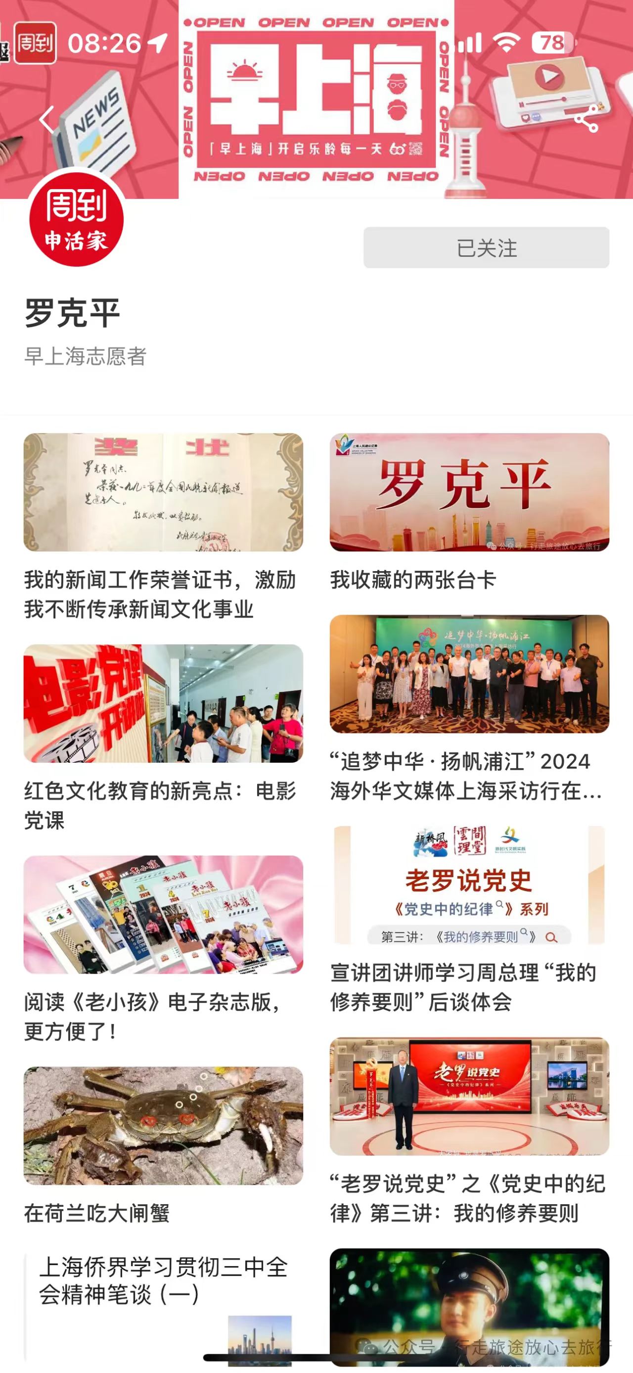 我作为“早上海老记团”的一名成员,一年来笔耕不辍,截至今天(2024年8月26日),已在《新闻晨报·周到上海》APP上发表文章282篇,文章包括早上海新闻、理论宣讲、人民建议、侨联工作、社会公益、终身教育、文化和旅游等栏目内容。