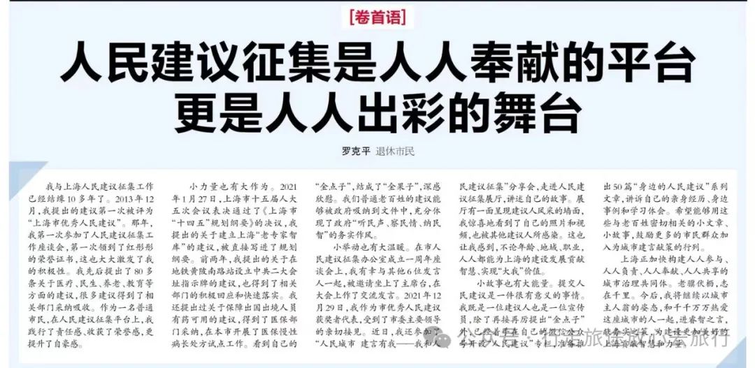 ![]() 作者表示:上海正加快构建人人参与、人人负责、人人奉献、人人共享的城市治理共同体。老骥伏枥,志在千里。今后,我将继续以城市主人翁的姿态,和千千万万热爱这座城市的人一起,进睿智之言,献务实之策,为建设更加美好的上海贡献智慧和力量。 人民建议征集是人人奉献的平台 更是人人出彩的舞台 罗克平 我与上海人民建议征集工作已经结缘10多年了。2013年12月,我提出的建议第一次被评为“上海市优秀人民建议”。那年,我第一次参加了人民建议征集工作座谈会,第一次领到了红彤彤的荣誉证书,这也大大激发了我的积极性。我先后提出了80多条关于医疗、民生、养老、教育等方面的建议,很多建议得到了相关部门采纳吸收。作为一名普通市民,在人民建议征集平台上,我践行了责任感、收获了荣誉感,更提升了自豪感。 小力量也有大作为。2021年1月27日,上海市十五届人大五次会议表决通过了《上海市“十四五”规划纲要》的决议,我提出的关于建立上海“老专家智库”的建议,被直接写进了规划纲要。前两年,我提出的关于在地铁站设立红色地标指示牌的建议,也得到了相关部门的积极回应和快速落实。我还提出过关于保障出国出境人员有药可用的建议,得到了医保部门采纳,在本市开展了医保慢性病长处方试点工作。看到自己的“金点子”,结成了“金果子”,深感欣慰。我们普通老百姓的建议能够被政府吸纳到文件中,充分体现了政府“听民声、察民情、纳民智”的务实作风。 小举动也有大温暖。在市人民建议征集办公室成立一周年座谈会上,我有幸与其他6位发言人一起,被邀请坐上了主席台,在大会上作了交流发言。2021年12月29日,我作为市优秀人民建议获奖者代表,受到了市委主要领导的亲切接见。近日,我还参加了“人民城市 建言有我——我和人民建议征集”分享会,走进人民建议征集展厅,讲述自己的故事。展厅有一面呈现建议人风采的墙面,我惊喜地看到了自己的照片和视频,也被其他建议人所感染。这也让我感到,不论年龄、地域、职业,人人都能为上海的建设发展贡献智慧、实现“大我”价值。 小故事也有大能量。提交人民建议是一件很有意义的事情。我既是一位建议人也是一位宣传员,除了再接再厉提出“金点子”外,已经着手在自己的微信公众号开设“人民建议”专栏,准备推出50篇“身边的人民建议”系列文章,讲诉自己的亲身经历、身边事例和学习体会。希望能够用这些与老百姓密切相关的小文章、小故事,鼓励更多的市民群众加入为城市建言献策的行列。 上海正加快构建人人参与、人人负责、人人奉献、人人共享的城市治理共同体。老骥伏枥,志在千里。今后,我将继续以城市主人翁的姿态,和千千万万热爱这座城市的人一起,进睿智之言,献务实之策,为建设更加美好的上海贡献智慧和力量。 ![]() 作者简介 罗克平:编审,资深主编,旅游文学作家,出版了《行走旅途——全球值得一游的N处》《千帆太湖》等著作。被收录到“百度百科”人物。 发表作品1000多万字,分别被《人民日报》《解放日报》《文汇报》《新民晚报》《中国民航报》等报刊刊登。 罗克平先生到过50多个国家和地区采访、旅游。在上海人民广播电台《放心去旅行》栏目连续5年担任嘉宾,介绍了荷兰、德国、法国、瑞士、新西兰、南非等24个国家的182期旅游节目。 (晓歌编辑) (责任编辑:晓歌) |
