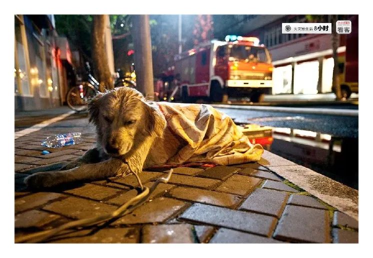 火灾现场动人一刻:2010年11月15日从胶州路大火现场逃出来的一条小狗趴在公寓外,眼里不停地留泪,望着火灾现场。有人送给它食物,它却不吃不喝。有人猜测,小狗是在守望着主人。