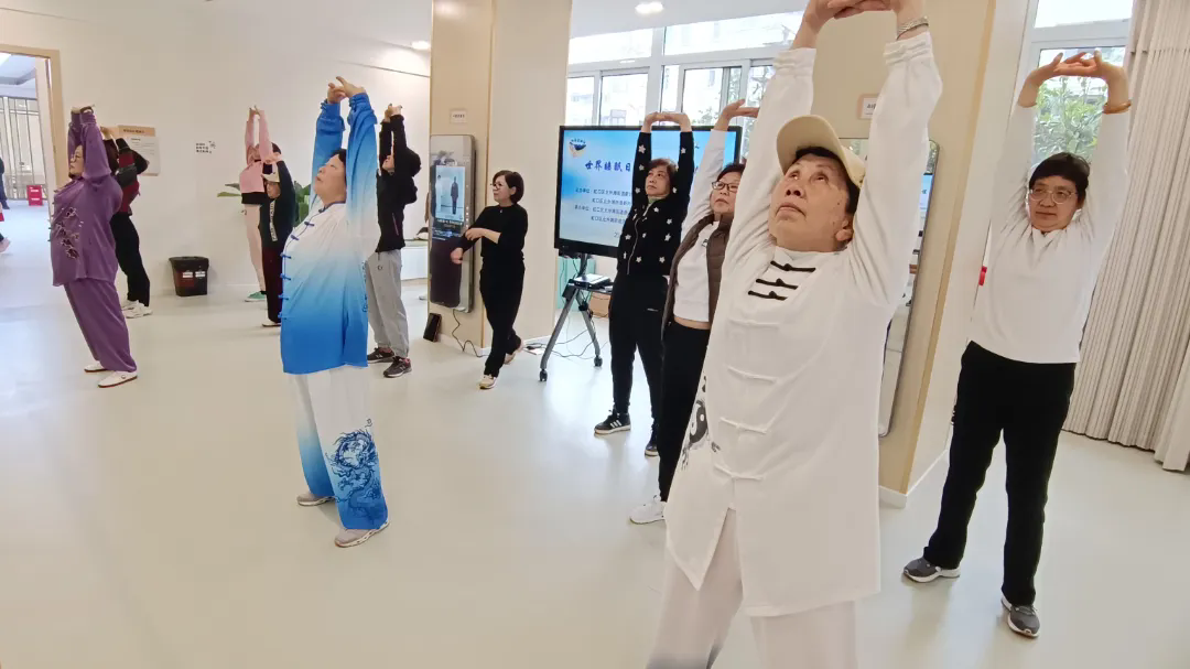 早上八点半,家住北外滩街道的范奶奶早早地来到北外滩街道第三市民驿站综合为老服务中心,年近80岁的她,手脚麻利,跟工作人员一起帮忙开窗通风、打开大屏幕、准备活动场地,迎接即将到来的早操队的姐妹们。