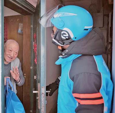 北京市朝阳区柳芳北里社区居民蒋老先生在接受送餐服务。 王 君摄