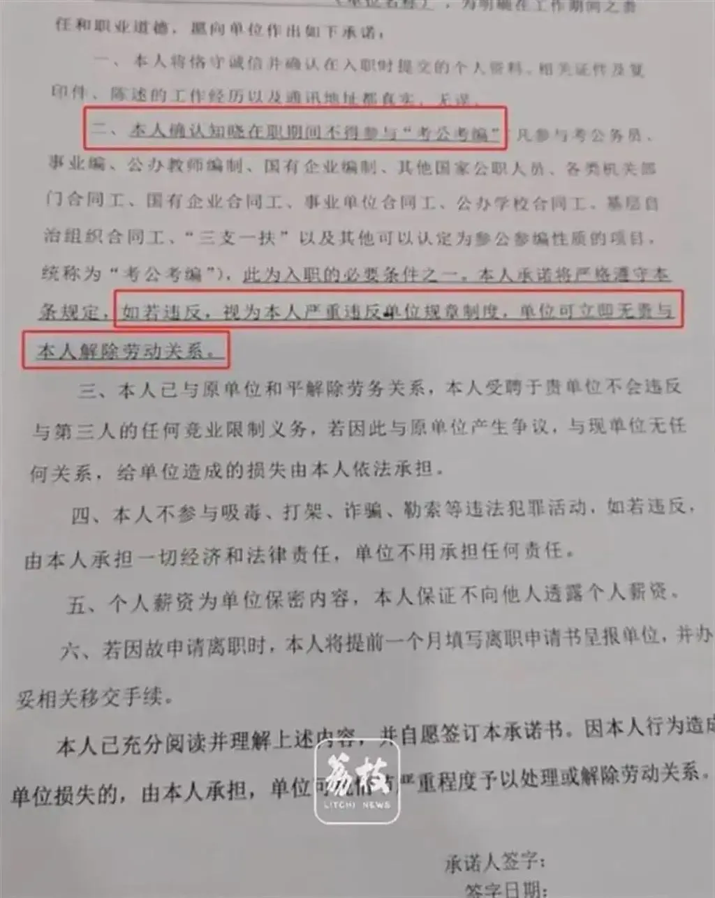 4月14日,安徽省滁州市南谯区教育体育局就“要求新入职教师不得考编”一事公开通报称,目前已纠正,区教体局责成涉事的集团要切实保障教职工合法权益。 经查,安徽新锐控股集团在教师聘用过程中,以保障教学稳定性为由,要求新入职教师签订不得参加公务员及编制类考试承诺书的情况属实。目前,该集团已纠正“要求教师入职前签订不得参加公务员及编制类考试承诺书”的行为;区教体局责成该集团要切实落实到位,依法依规保障教职员工合法权益,并加大对教职员工的关心关爱,确保教育教学秩序稳定。 此前,据荔枝新闻报道称,4月11日,位于安徽滁州的安徽新锐教育集团,被曝要求新入职教师签订“不参加考公考编承诺书”,违者将被处罚并通报。报道称,安徽新锐教育集团旗下多所滁州学校教师反映,入职时被要求签订“不参加考公考编承诺书”。滁州市公务员或者事业编考试当天,学校会对符合考试条件的教师挨个打电话,或拉工作群开视频会议,没有及时回消息的教师,会被认定为参加考公考编,将对参与考公考编人员进行处罚并通报。滁州市新锐学校工作人员称,此举是为了保证教学工作稳定,教师不接受可以不签合同。
