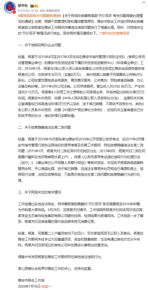 关心:不能说舆论当初对黄杨钿甜事件质疑错了【文/观察者网专栏作者 关心】 演员黄杨钿甜网传“天价耳环”事件,算是尘埃落定了。今年5月,黄杨钿甜在社交平台分享的成人礼照片中,佩戴的耳环被指与奢侈品牌GRAFF经典款高度相似,公价约230万,“年轻演员怎么戴得起天价饰品”的质疑,瞬间冲上热搜。对此,黄杨钿甜及母亲解释,耳环是2016年朋友赠送的仿制品,全套仅300元,“火彩”是相机闪光灯效果;其父杨伟曾在雅安公职系统工作,也承诺“接受鉴定”。随后,雅安市纪委监委介入调查。 7月16日,官方进一步通报调查结果:经鉴定,耳环实为玻璃材质(含金属配件),全套仅300元;杨伟在职期间违规以亲属名义经商,分得3万元利润(因已辞职未受政务处分);隐瞒2011年生育二孩问题,因政策变化不再追究。网传“亿元别墅”“慈善总会关联”均为不实。至此,这场风波的全景已经展开。我们注意到,调查进行过程中,已有多名就此事编造、散布谣言者被依法查处,伴随着最终调查结果的出炉,网上有不少论调话锋突转,把此事形容为“不合理质疑+网络谣言”催生的闹剧,不少网友的一句“散了散了”,也让这场网民积极参与、官方严肃对待的“监督”,失了本该有的“庄重感”,似乎加重了民众对此类事件往往以“轻轻放下”收场的错觉。 那么,到底什么才算“合理质疑”?网络信息纷杂,管理起来本就是极其困难的,不排除有人借热点造谣混淆视听。但更需明确的是:民众对贪腐、权力寻租的质疑,是公民监督权的正当行使,不该因个别谣言被打消。