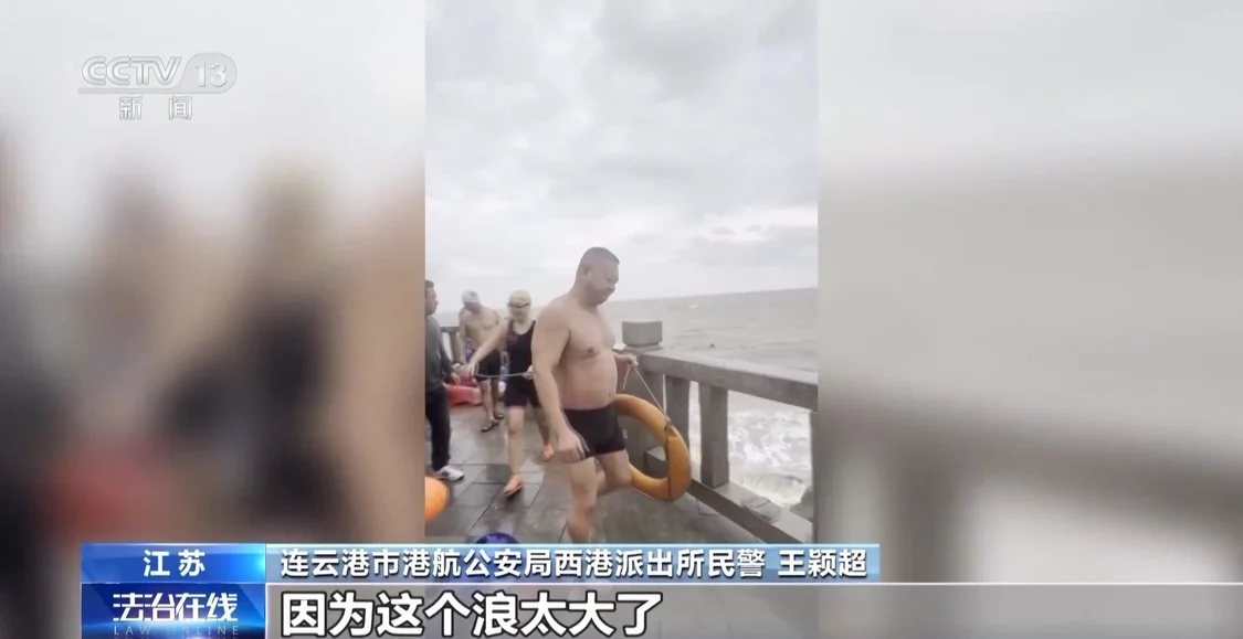 连云港市港航公安局西港派出所民警 王颖超:我来的时候,正好看到这边一群人趴在栅栏上,站在栅栏上有的人在哭叫有的人在喊救命。我抱着游泳圈、绳子来的时候,有一个同志到我面前说,有游泳圈有绳子,他可以跟我一起配合救人。当时我心里是担心的,我是拒绝了他。 这位主动找到民警志愿下水救人的男子名叫王玉平。由于海浪凶猛,贸然下水极有可能发生危险,出于安全考虑,民警一开始并没有同意让王玉平下水协助救人。