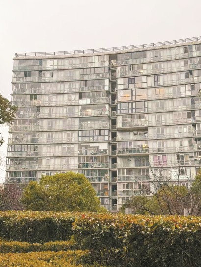 三林中房樱桃苑小区楼栋朝南的外立面以大面积玻璃为主要视觉元素。 王一凡 摄