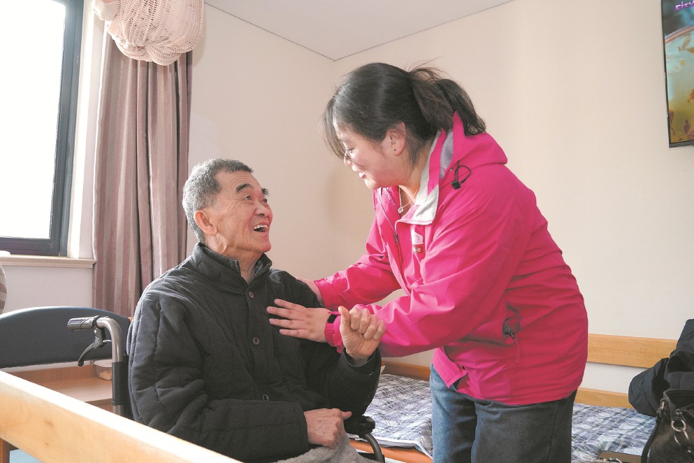 徐汇区第三老年福利院的护工为老人们提供周到的帮扶照顾服务。 文汇报记者 邢千里摄