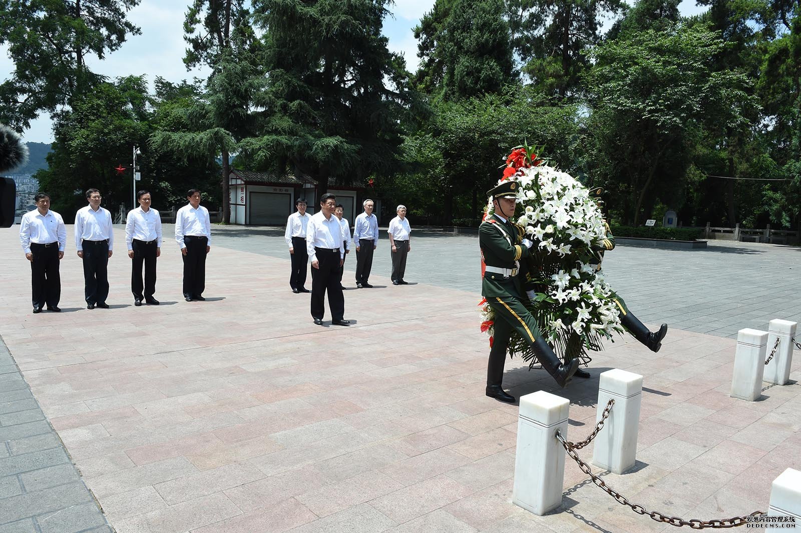 习近平来到红军山烈士陵园,向红军烈士纪念碑敬献花篮。 习近平考察贵州 首站遵义 蓝天白云,青松翠柏。习近平总书记16日离京来到贵州遵义考察,一下飞机就直奔红军山烈士陵园,向红军烈士纪念碑敬献花篮。纪念碑四周的浮雕展现了当年红军浴血奋战的场景。在“突破乌江天险”浮雕前,总书记驻足感叹:“当时要是过不去就危险了……”碑上“红军烈士永垂不朽”8个字是邓小平同志题写的,他伫立凝望,听取介绍。这是党的十八大后习近平总书记第一次来黔考察。 背景:遵义 古称播州,因遵义会议彪炳史册。1935年,红军在这里转战3个多月,演绎了四渡赤水的传奇。这里是中国共产党第一代中央领导集体开始形成的地方,是毛泽东思想开始形成的地方,是党独立自主解决自身重大问题开始的地方。近年来,遵义加快了后发赶超、全面建设小康社会的步伐。 习近平参观遵义会议会址 1935年1月召开的遵义会议是中国共产党历史上的重要转折点。16日下午,习近平来到遵义会议会址参观。他走进周恩来、朱德等老一辈革命家住过的房间和遵义会议会议室,在遵义会议参会人员照片前久久凝视,听取讲解。在二楼走廊,纪念馆馆长指着楼旁一棵枝繁叶茂的槐树告诉总书记,这棵树遵义会议时就有了,当年是一棵小槐树,现在已经长成大槐树了。总书记微笑着点点头。 叮嘱讲解员“给大家好好讲” 习近平来到遵义会议陈列馆序厅,走到20位遵义会议参会人员群雕前。在一张张图片图表和一个个实物模型、模拟场景前,习近平不时驻足停留,了解有关情况,“乌江渡口还是原貌吗?”“遵义原来有没有革命活动?”……看完3分钟的“四渡赤水”多媒体演示片,总书记说:“毛主席用兵如神!真是游击战的典范。”看到总书记,正在参观的群众纷纷围了上来,总书记同大家热情握手。临别时,总书记对讲解员说:“你讲得很好。要给大家好好讲,告诉大家我们党是怎么走过来的。” 背景:遵义会议陈列馆 2012年,遵义会议陈列馆改扩建工程列入全国红色旅游二期工程规划重点项目,并于2013年动工,今年1月15日即遵义会议召开80周年之际重新对公众开放。建筑面积近2万平方米,展厅面积7000平方米。展陈以长征为主线,展示了磅礴厚重的长征文化。 习近平考察遵义花茂村