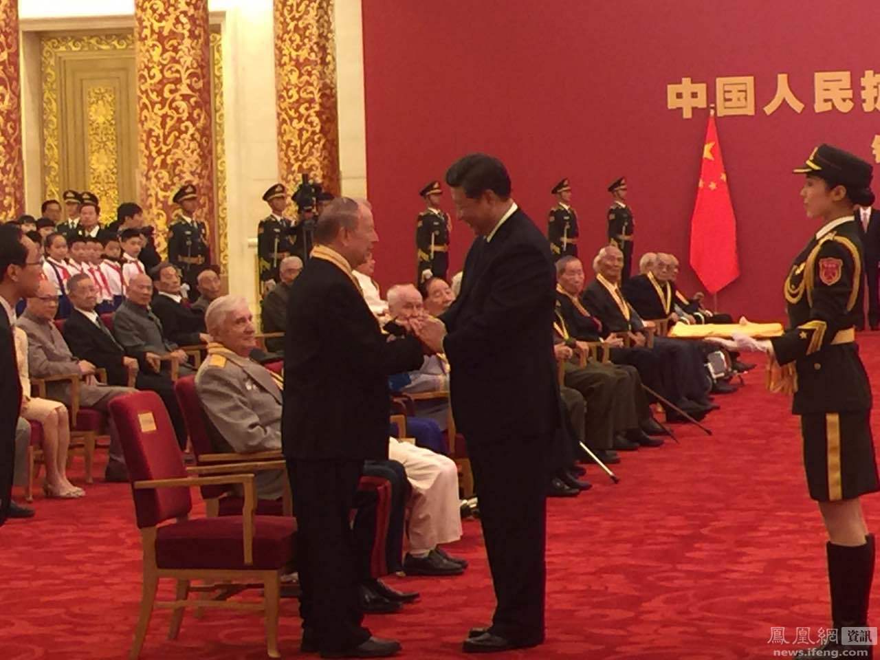 ![]() 2日上午,中共中央总书记、国家主席、中央军委主席习近平在人民大会堂,向30名抗战老战士老同志、抗战将领、为中国抗战胜利作出贡献的国际友人或其遗属代表颁发纪念章并发表重要讲话。李克强、张德江、俞正声、刘云山、王岐山、张高丽出席。 先前报道:习近平将为抗战老战士、老同志和抗战将领颁发纪念章 国务院新闻办公室副主任郭卫民8月25日在纪念抗战胜利70周年纪念活动新闻发布会上透露,9月2日上午,中共中央总书记、国家主席、中央军委主席习近平将为健在的抗战老战士、老同志,抗战将领或其遗属颁发纪念章。 郭卫民说,这次纪念章发放的主要对象: ——参加过抗日战争的八路军、新四军,中国共产党领导的华南抗日游击队、东北抗日联军和各地游击队的健在的老战士; ——抗日战争时期在中国共产党领导下从事地方工作和地下工作的健在的老同志; ——曾在国民党军队参加抗战并于解放战争时期及其以后参加革命工作(或入伍)以及回乡务农的健在的老战士、老同志; ——为中国人民抗日战争胜利作出贡献的海内外爱国人士、抗战将领中的代表人士; ——为中国人民抗日战争胜利作出贡献的国际友人中的代表人士。 此外,2015年1月1日后去世的抗战老战士、老同志在此次发放范围之内。