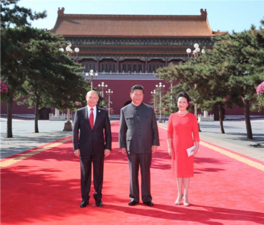 (中共中央总书记、国家主席、中央军委主席习近平和夫人彭丽媛在端门外广场迎接出席大会的外方代表团团长及其配偶,并同他们合影留念。这是习近平夫妇与俄罗斯总统普京合影。新华社记者 丁林 摄) 一次五大洲爱好和平力量的聚首 金色的阳光,洒向天安门城楼北侧的端门广场。 9月3日早上,习近平主席和夫人彭丽媛面带微笑站在这里,迎候前来出席纪念大会的外国嘉宾及其配偶或子女,同他们一一握手,合影留念。 随后,65位外国领导人、政府高级别代表、联合国等国际组织负责人、前政要聚首天安门城楼。他们中,有俄罗斯总统普京、韩国总统朴槿惠等周边国家元首,也有南非总统祖马、委内瑞拉总统马杜罗等遥远国度领导人;有联合国秘书长潘基文、世界卫生组织干事长陈冯富珍等国际组织负责人,也有德国前总理施罗德、英国前首相布莱尔等中国人耳熟能详的前政要。 法国外长法比尤斯、意大利外长真蒂洛尼、美国驻华大使博卡斯等,也作为各自国家政府代表出席。 这是一次名副其实的五大洲的聚会。这次阅兵还首次邀请外国军队参加,于是,17个外国方队或代表队首次走过天安门广场。30个外军观摩团团长也在现场观礼。 8月31日下午3时,人民大会堂东大厅外,塞尔维亚总统尼科利奇与习近平主席紧紧握手。这是习近平主席会见的第一个来华出席纪念活动的外国领导人。面对东道主,尼科利奇热情洋溢地说:我们是与中国人民、与全世界人民一起庆祝胜利、分享喜悦。
