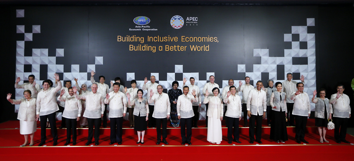 菲律宾设计师保罗·卡布拉尔为本届APEC峰会设计的服装。 【习近平身着当地特色服饰参加APEC欢迎晚宴】北京时间今天晚上,国家主席习近平身穿当地特色服饰“巴隆他加禄”,出席菲律宾总统为与会领导人举行的欢迎晚宴。习近平大厅门口挥手致意,菲律宾总统阿基诺三世携夫人在大厅迎接,二人握手并合影留念。 解说:您现在看到的就是APEC峰会上面各领导人现在都站在台上,每一次的峰会都有一个例行的传统,就是东道主国都会让出席APEC峰会的领导人或代表,穿上他们当地的传统服饰。现在看到的就是我们各领导人都穿上了菲律宾的传统服饰,站在台上,马上就会进行一个大合影。 菲律宾总统阿基诺三世在结束APEC第23次领导人第一天正式会议后就会举行欢迎晚宴,而中国国家主席习近平也会在19号出席区域跟全球经济专题会议两阶段领导人非正式的会议跟午宴。这次的会议为期是两天,星期四就会结束,届时就会发表领导人宣言。 这一次APEC领导人将会单独就支持多边贸易体制发表一个声明,以表达对APEC支持多边贸易体制的一个决心。这一次的峰会主要是在今天下午在菲律宾举行,会议会集中讨论区域的经济一体化还有可持续增长等等,包括中国国家主席习近平在内的20个国家的领导人都出席了这一次的会议。而这一次会议的主题就是要打造包容性的经济,还有建设更为美好的世界,具体的议题也包括像区域经济的一体化,中小企业还有人力资源开发,以及可持续增长等等。