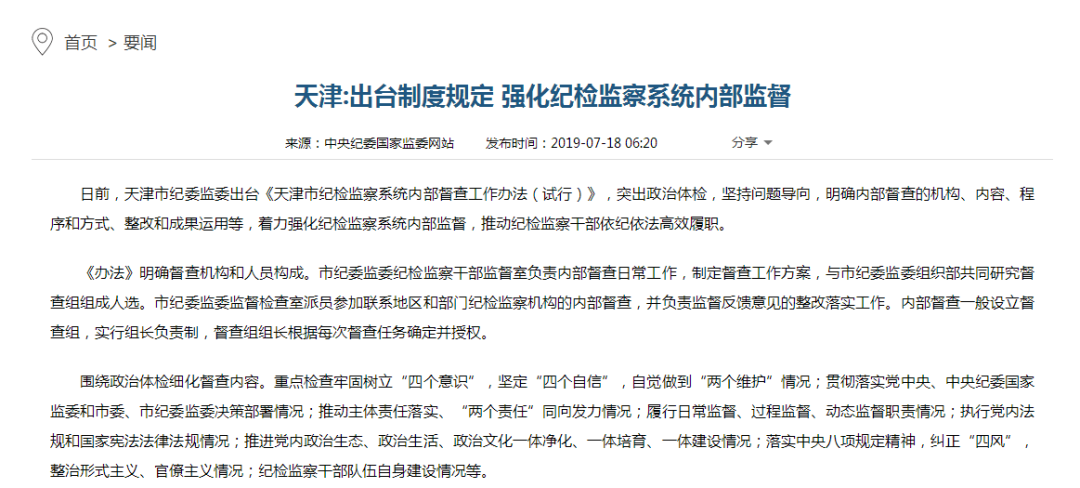“被督查单位领导班子及成员应自觉接受督查监督,积极支持和配合督查组工作,对提供虚假情况、干扰阻碍督查工作、打击报复反映问题人员,或对反馈问题整改不力的,严肃问责”。 青海不是唯一一个开展内部督查的省份。 今年7月18日,天津市纪委监委出台《天津市纪检监察系统内部督查工作办法(试行)》。