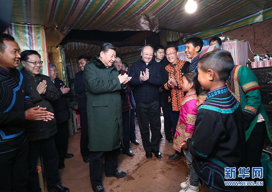 2018年2月11日,农历春节来临之际,习近平在四川凉山彝族自治州昭觉县三岔河乡三河村贫困户吉好也求家中看望,听10岁小女孩吉好有果唱《国旗国旗真美丽》。 新华社记者 鞠鹏 摄