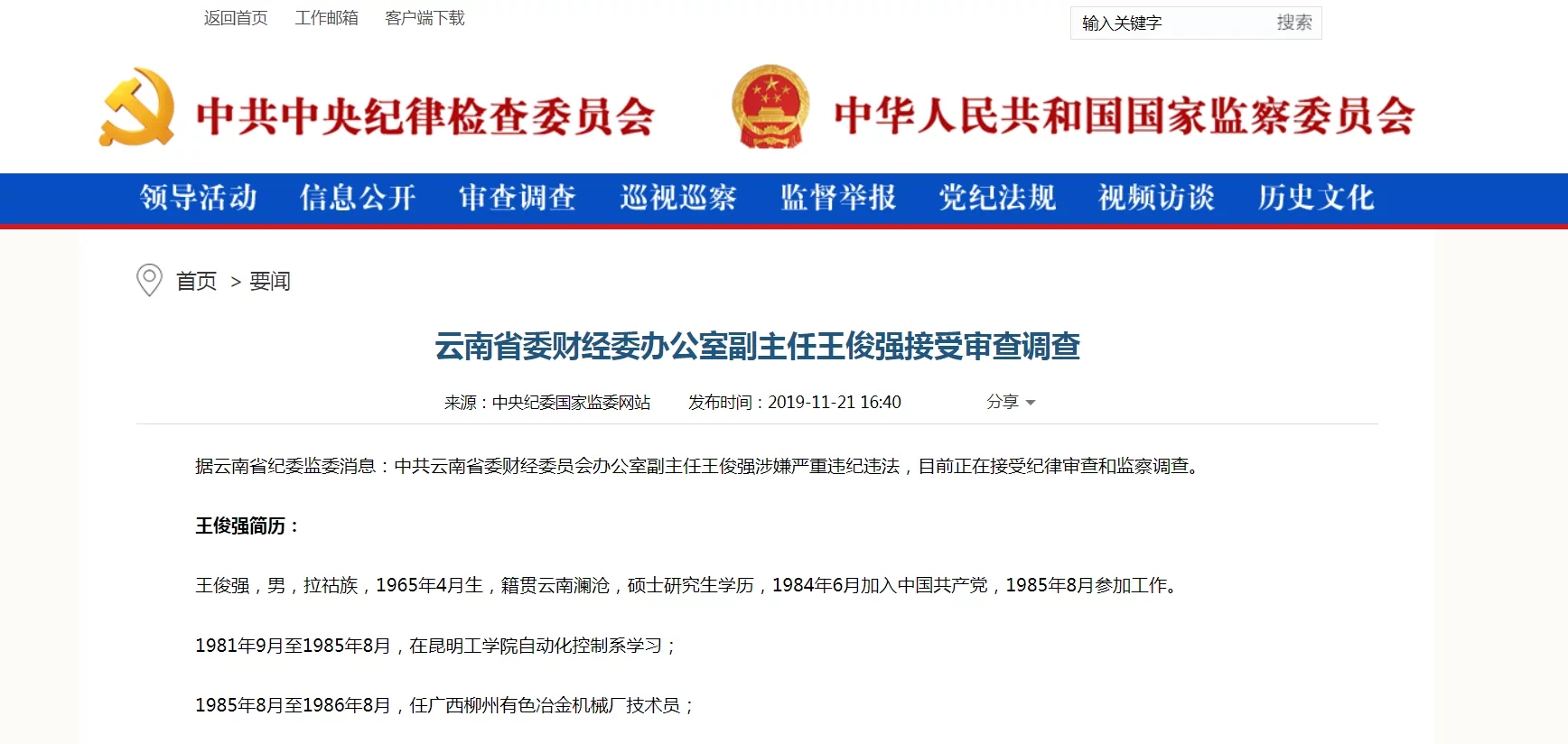![]() 云南省委财经委员会办公室副主任王俊强(正厅级)涉嫌受贿一案,由云南省监察委员会调查终结,移送检察机关审查起诉。日前,云南省人民检察院依法以涉嫌受贿罪对王俊强作出逮捕决定。案件正在进一步办理中。5月15日,最高人民检察院在官方公众号对此进行了通报。 2019年11月21日,云南省纪委监委曾发布通报,中共云南省委财经委员会办公室副主任王俊强涉嫌严重违纪违法,目前正在接受纪律审查和监察调查。 ![]() 王俊强简历: 王俊强,男,拉祜族,1965年4月生,籍贯云南澜沧,硕士研究生学历,1984年6月加入中国共产党,1985年8月参加工作。 1981年9月至1985年8月,在昆明工学院自动化控制系学习; 1985年8月至1986年8月,任广西柳州有色冶金机械厂技术员; 1986年8月至1988年8月,就读中南工业大学自动化系研究生; 1988年8月至1995年8月,任昆明理工大学自动化系团总支书记、学生党支部书记(其间:1988年9月至1989年9月,参加云南省讲师团赴宾川县支教); 1995年8月至1997年3月,任思茅行署经贸委主任助理(副处); 1997年3月至1999年3月,任思茅港管委会副主任; 1999年3月至2001年1月,任思茅地区墨江县委副书记; 2001年1月至2004年2月,任思茅地区墨江县委书记; 2004年2月至2005年8月,任思茅市委常委、墨江县委书记; 2005年8月至2007年9月,任云南省国土资源厅党组成员、副厅长; 2007年9月至2011年12月,任云南省人民政府副秘书长、办公厅党组成员; 2011年12月至2014年1月,任中共云南省德宏傣族景颇族自治州委副书记(正厅级),兼任瑞丽沿边重点开发开放试验区党委书记、主任; 2014年1月至2019年10月,任中共云南省德宏傣族景颇族自治州委书记; 2019年10月至今,任中共云南省委财经委员会办公室副主任。 (责任编辑:晓歌) |