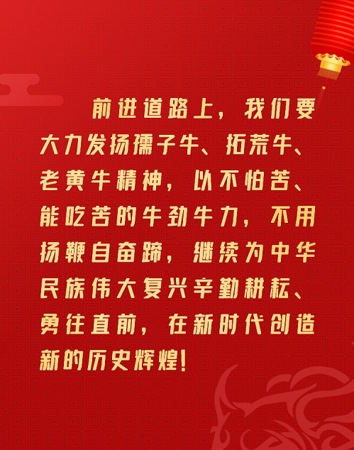 ![]() “寒辞去冬雪,暖带入春风。”牛年春节到来之际,习近平总书记在2021年春节团拜会上发表重要讲话,向广大中华儿女致以新春祝福。站在“两个一百年”的历史交汇点上,展望全面建设社会主义现代化国家新征程,总书记鉴往知来,以党的百年历史砥砺初心,用“三牛”精神激励亿万人民顽强拼搏,让这个春天充满奋进力量,充满美好希望。 事非经过不知难。回首过去一年,多少感慨涌上心头。我们经历了惊心动魄的风云突变,也投身豪情万丈的砥砺前行。以习近平同志为核心的党中央团结带领全国各族人民众志成城、迎难而上,战疫情、抗洪涝,促改革、推开放,抓脱贫、惠民生,保增长、稳大局,全面建成小康社会取得伟大历史性成就,脱贫攻坚目标任务如期完成,各项事业取得新的重大成就。这份人民满意、世界瞩目、可以载入史册的答卷,浸透着奋斗者的汗水,蕴含深刻启示——中国特色社会主义制度具有无比强大的生命力和创造力,中国人民和中华民族具有无比强大的凝聚力和向心力。 冬去春来,我们迎来新的一年,新时代中国开始新的出发。全面建成小康社会,实现第一个百年奋斗目标,只是迈向中华民族伟大复兴的关键一步。新征程上,我们还要乘势而上、再接再厉,继续谦虚谨慎、戒骄戒躁,继续艰苦奋斗、锐意进取,努力实现“十四五”时期发展开好局、起好步,为实现第二个百年奋斗目标、实现中华民族伟大复兴而奋力拼搏。 奋斗百年路,启航新征程。从石库门到天安门,从兴业路到复兴路,中国共产党已经发展成为一个在最大的社会主义国家执政70多年、拥有9100多万党员的世界上最大的马克思主义执政党,得到了14亿中国人民最广泛的支持和拥护。从站起来、富起来到强起来,一部百年奋斗史告诉我们,办好中国的事情,关键在党,中国发展的最大优势就是党的领导。新征程上,面对艰难险阻乃至惊涛骇浪,只要我们党不断深化自我革命,始终站在时代潮流最前列、站在攻坚克难最前沿、站在最广大人民之中,定能永葆蓬勃朝气、昂扬斗志,始终成为中国人民最可靠的主心骨,永远立于不败之地。 俗话说,牛马年,好耕田。中华文化里,牛是勤劳、奉献、奋进、力量的象征。新征程上,牢记为民初心,不断增强人民群众的获得感、幸福感、安全感,呼唤为民服务、无私奉献的“孺子牛”;践行新发展理念,构建新发展格局,深化改革开放,需要创新发展、攻坚克难的“拓荒牛”;面对风险挑战,完成艰巨任务,一步一个脚印向前进,离不开艰苦奋斗、吃苦耐劳的“老黄牛”。大力发扬“三牛”精神,就是要保持“闯”的精神、“创”的劲头、“干”的作风,以不怕苦、能吃苦的牛劲牛力,继续为民族复兴伟业辛勤耕耘,创造无愧于新时代的新业绩。 乘风破浪正当时,不待扬鞭自奋蹄。新征程,是国家发展的新征程,也是你我迈向更美好生活的新征程。带着梦想再出发,人人苦干实干、个个担当尽责,汇聚起亿万人民心往一处想、劲往一处使的磅礴之力,新时代中国一定“牛”! 责任编辑:日升 (责任编辑:日升) |