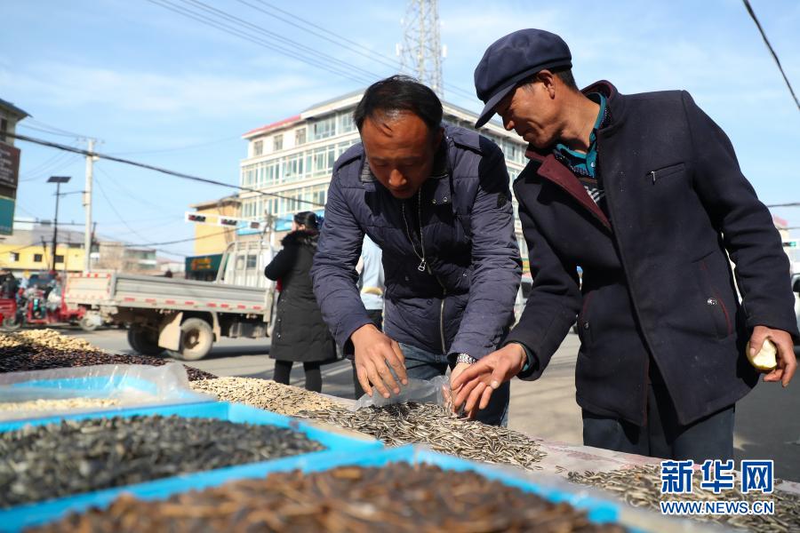 2月7日,在甘肃省定西市渭源县会川镇集市上,元古堆村村民曾玉成(右)在置办年货。 新华社记者 马希平 摄