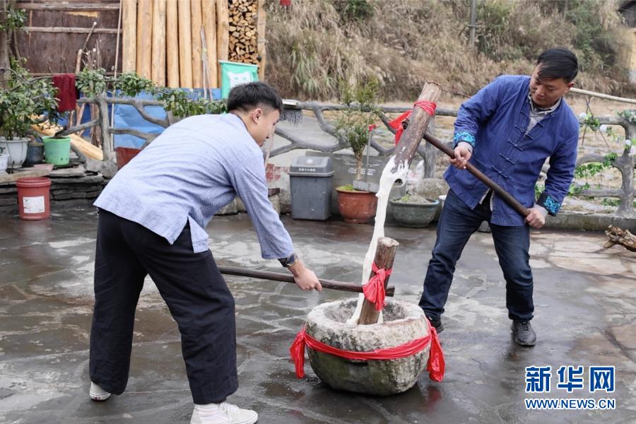 2月3日,在湖南省湘西土家族苗族自治州花垣县十八洞村,村民在打糍粑,储备过年物资。 新华社记者 陈思汗 摄