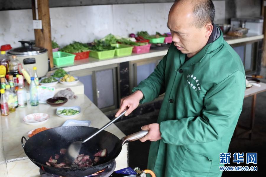 2月2日,在湖南省湘西土家族苗族自治州花垣县十八洞村,杨正邦在炒腊肉。 新华社记者 陈思汗 摄
