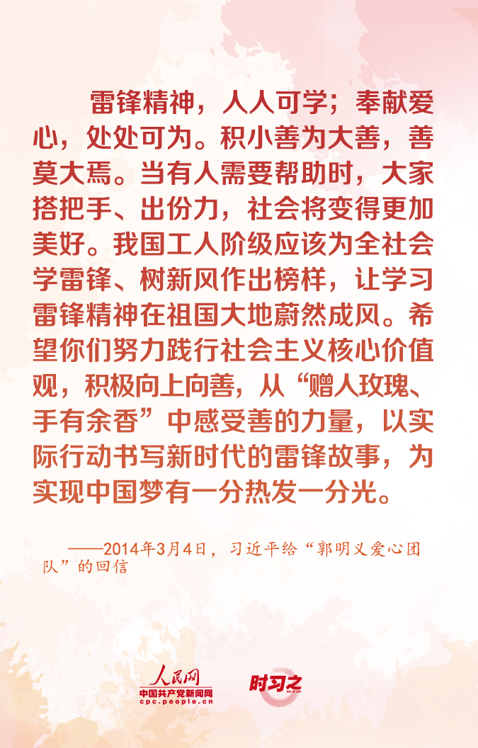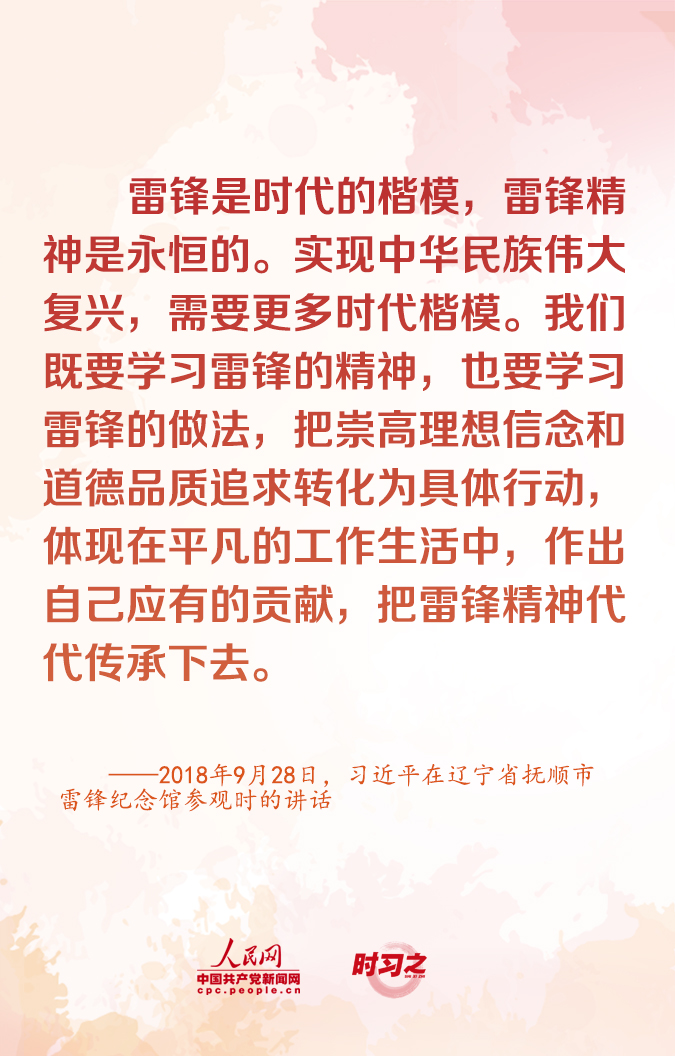 3月5日是学雷锋纪念日。“雷锋精神是永恒的,是社会主义核心价值观的生动体现 ”“把雷锋精神代代传承下去 ”“让学习雷锋精神在祖国大地蔚然成风 ”……党的十八大以来,习近平总书记多次就学习和弘扬雷锋精神作出重要论述。新时代的雷锋精神是否有新的内涵?新时代该如何继续弘扬雷锋精神?让我们从习近平总书记的讲话和信里寻找答案。