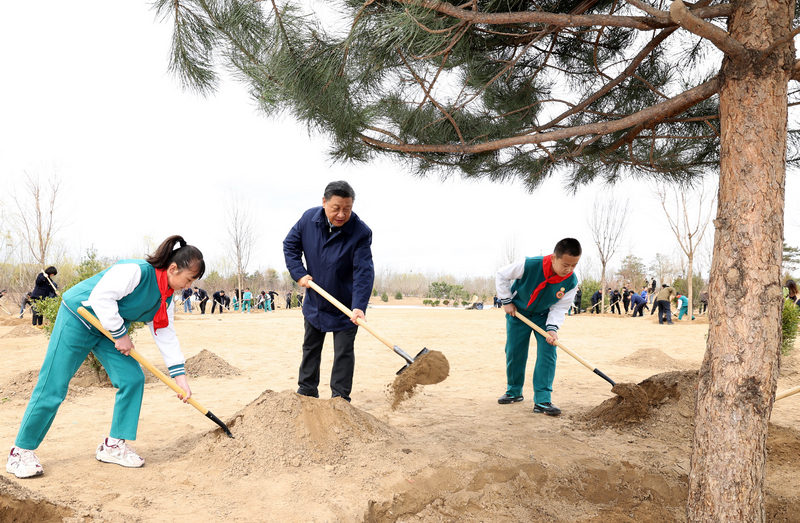![]() 中共中央总书记、国家主席、中央军委主席习近平30日上午在参加首都义务植树活动时强调,党的十八大以来,我连续10年同大家一起参加首都义务植树,这既是想为建设美丽中国出一份力,也是要推动在全社会特别是在青少年心中播撒生态文明的种子,号召大家都做生态文明建设的实践者、推动者,持之以恒,久久为功,让我们的祖国天更蓝、山更绿、水更清、生态环境更美好。 春回大地,万物更新。上午10时30分许,党和国家领导人习近平、李克强、栗战书、汪洋、王沪宁、赵乐际、韩正、王岐山等集体乘车,来到位于北京市大兴区黄村镇的植树点,同首都群众一起参加义务植树。 植树点位于大兴新城城市休闲公园内,面积约1500亩。这一地块原为水库滩涂地,目前规划为城市公园,建成后将成为周边群众休闲娱乐、亲近自然的生态空间。 看到总书记来了,正在这里植树的干部群众热情地向总书记问好。习近平向大家挥手致意,拿起铁锹走向植树地点,随后同北京市、国家林业和草原局负责同志以及首都干部群众、少先队员一起忙碌起来。 挥锹铲土、培土围堰、提水浇灌……习近平接连种下油松、碧桃、白玉兰、海棠、小叶白蜡等多棵树苗。习近平一边劳动,一边询问孩子们学习生活情况,叮嘱他们要德智体美劳全面发展,不能忽视“劳”的作用,要从小培养劳动意识、环保意识、节约意识,勿以善小而不为,从一点一滴做起,努力成长为党和人民需要的有用之才。植树现场一派繁忙景象,参加劳动的领导同志同大家一起培土浇水、亲切交流,气氛热烈。 植树间隙,习近平对在场的干部群众强调,实现中华民族永续发展,始终是我们孜孜不倦追求的目标。新中国成立以来,党团结带领全国各族人民植树造林、绿化祖国,取得了历史性成就,创造了令世人瞩目的生态奇迹。党的十八大以来,我们坚持绿水青山就是金山银山的理念,全面加强生态文明建设,推进国土绿化,改善城乡人居环境,美丽中国正在不断变为现实。同时,我们也要看到,生态系统保护和修复、生态环境根本改善不可能一蹴而就,仍然需要付出长期艰苦努力,必须锲而不舍、驰而不息。 习近平指出,森林是水库、钱库、粮库,现在应该再加上一个“碳库”。森林和草原对国家生态安全具有基础性、战略性作用,林草兴则生态兴。现在,我国生态文明建设进入了实现生态环境改善由量变到质变的关键时期。我们要坚定不移贯彻新发展理念,坚定不移走生态优先、绿色发展之路,统筹推进山水林田湖草沙一体化保护和系统治理,科学开展国土绿化,提升林草资源总量和质量,巩固和增强生态系统碳汇能力,为推动全球环境和气候治理、建设人与自然和谐共生的现代化作出更大贡献。 习近平强调,植绿护绿、关爱自然是中华民族的传统美德。要弘扬塞罕坝精神,继续推进全民义务植树工作,创新方式方法,加强宣传教育,科学、节俭、务实组织开展义务植树活动。各级领导干部要抓好国土绿化和生态文明建设各项工作,让锦绣河山造福人民。