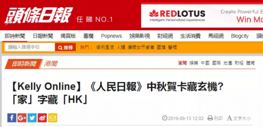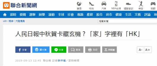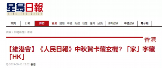 中秋月圆夜,这个家里少不了你——HK 《人民日报》中秋“贺卡”藏玄机?今天(9月13日)是中秋节,《人民日报》官方微博昨日(12日)晚间发了一条贴文,提前庆中秋。贴文写道,“中秋月圆夜,这个家里少不了你”,并附上了一张写有“家”字的图片。而这张图片,被港媒和台媒发现“暗藏玄机”。
