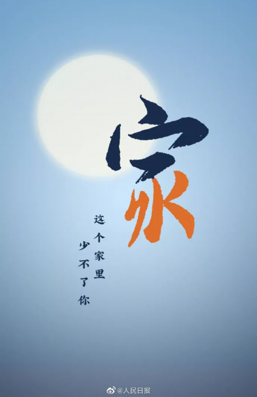 《人民日报》微博所发图片 香港《星岛日报》13日报道称,香港“修例风波”三个月以来,爆发多场冲突,社会气氛紧张。《人民日报》借中秋节推出“贺卡”,背景是一轮明月,以一个大的“家”字为主题,写上“这个家里,少不了你”。↓