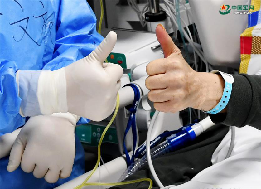 火神山医院重症医学一科自2月10日开始收治重症患者以来,全科医护人员不畏风险全力救治,他们根据患者病情的变化,有预见性地快速调整救治方案,采取呼吸支持、抗病毒、维护脏器功能、加强营养等方法,使重症患者逐渐有了好转,提高了救治成功率。互相鼓励点赞,是在重症室看到最多的场景。解放军报记者王传顺 摄