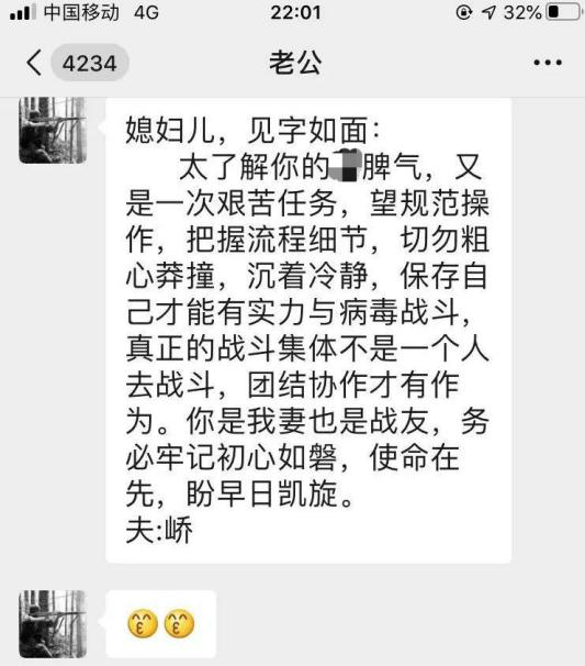军队支援湖北医疗队队员彭渝瞒着家人驰援武汉,丈夫直到看见别人发的照片,才知道她已经出发。两人在电话里大吵一架,冷静之后,同为军人的丈夫给彭渝发了一条微信“你是我妻也是战友,盼凯旋!”看到微信,彭渝落泪……