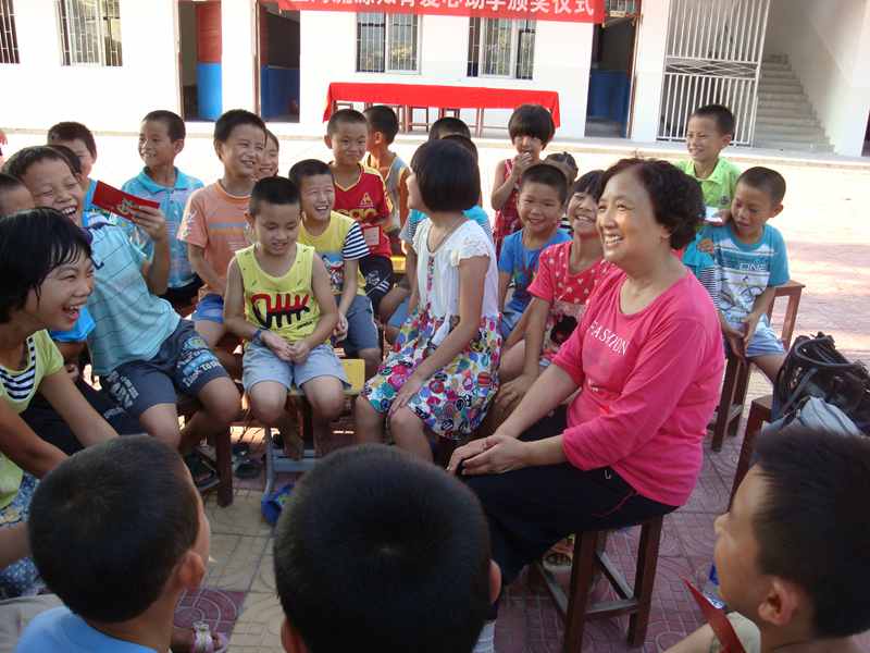 当天下午的全校大会,举行了颁奖仪式。仪式虽简短但隆重热烈,连乡里、县里都来了领导。除了校长讲话、获奖师生代表讲话,我也代表基金会发言,鼓励他们爱家乡、爱父母、爱学习。师生们质朴的讲话令我感动。他们身在这边远的小山村,可一点也不闭塞,而是有远大的志向和目标,积极向上。我们按照学校报给我们的各年级各班级学习成绩排名前三的优秀学生名单,逐一颁发奖学金。听老师们说这些孩子很努力,很自觉,那怕父母不在身边,他们照样会自己管好自己。会后我们和学生进行了互动,聊天,唱歌,做游戏。没想到县里还来了三个年轻记者进行全程摄影摄像报道,结束后还对我们知青进行了采访,对上海知青的深情厚意表示赞赏。