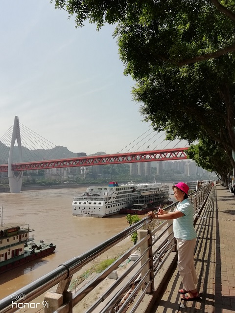 到了重庆,从游船上岸,走著名的朝天门码头,有几十级高高的台阶。这次三峡旅游一路上经过好几个景点,上岸都有很方便的直达电梯或摆渡缆车,可不知为何重庆这个最繁荣的大城市,码头上却没有安装电梯?这里还是原始的办法,要自己提着沉重的拉杆箱一步步爬上又高又陡的岸。许多游客望而生畏,只得请当地的挑夫(俗称棒棒)挑上岸。也许这是扶贫项目?或者是要让游客感受山城的特色?我想起在小说《红岩》中和许多影视作品中描绘过的闻名遐迩的朝天门码头,曾经热闹非凡,确实感到了它的不凡。-----多少年来,山城人就是这样上上下下的,没有走过朝天门码头,就不能算到过重庆。历史上它就是这里,一步步把进贡给朝廷的货物从这里挑上船运出去的。
