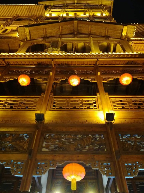 从我们住的旅馆到洪崖洞景区打车过去,明明出租车是在平地开的,可到了景区入口处,却发现已经是在很高的地方,在一幢大楼的第十一层处,要坐电梯才能下到一楼的江边。所以我们就去排队坐电梯下去。人实在太多了,等了很久才下到一楼,随着拥挤不堪的人群,汗流浃背地总算挤到了洪崖洞前,看到洪崖洞的全貌。