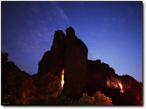 在月光下看,天空是白亮的,而山形是暗的,山体在夜空中突出了各种造型,这种夜晚很亮的情况在其他山区没有见过。我想,也许是雁荡山独特的靠海的地理位置造成的吧。