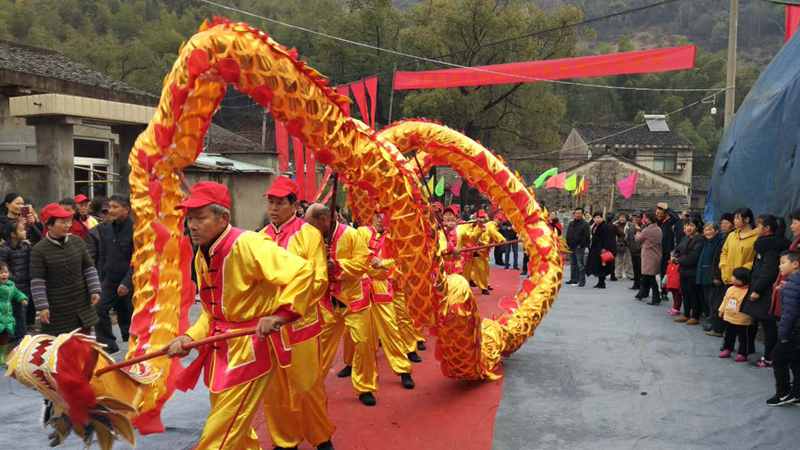 唐同春带我们一行三十人从上海坐大巴到达建岙村,是祠堂落成的当天上午。村口鼓乐鞭炮齐鸣,广场上彩旗招展,人群簇拥,舞龙队也浩浩荡荡开过来,从一长排各家各户的小轿车之间穿过,到达祠堂前,迎接四面八分宾客,一派热闹景象。