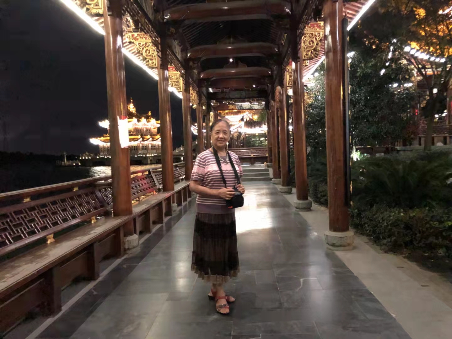 晚饭后,下了一场雨,我们却游兴未减。因为夜晚的小镇,更是美轮美奂,如梦如幻。到处灯火璀璨,如一串串明珠闪耀。虽然由于疫情,很少见到游客,但我们沿着湖边,坐电瓶车游览,只见一座座楼宇、宫殿、宝塔倒影在湖水中,晶莹闪亮,五彩缤纷,同行者纷纷拿起相机摄影。我们走进一条具有典型明清建筑风格的全长1200米的沿江文化长廊,仿佛走进了皇宫。同行的舞蹈队和模特团队的知青朋友们,在长廊内走秀,仿佛走在了梯台上。