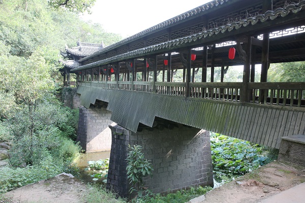 我们坐上景区接待方特地安排的电瓶车,在占地面积几百亩地的景区内绕了一大圈。经过了一座”彩虹桥”,它的结构是全红木的,据说投入红木3000余方,造价在一个亿,以传统的榫卯结构打造而成。远远的看,彩虹桥和它的倒影形成了一个完整的圈,从桥下穿过,抬头看桥,更为震撼。