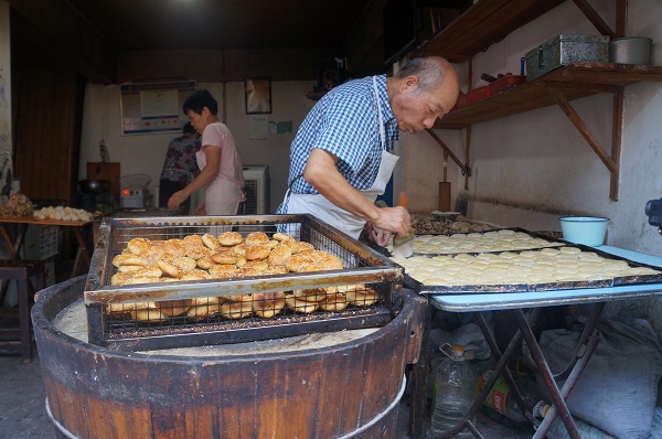 小镇虽然狭长拥挤,由长门板拼成的茶桌,也很简单朴素,但各种当地小吃品种繁多,十分诱人。一元一根的油条,二元一个的梅干菜油饼,二元一婉的咸豆浆或豆花,都比上海便宜了许多,味道毫不逊色。