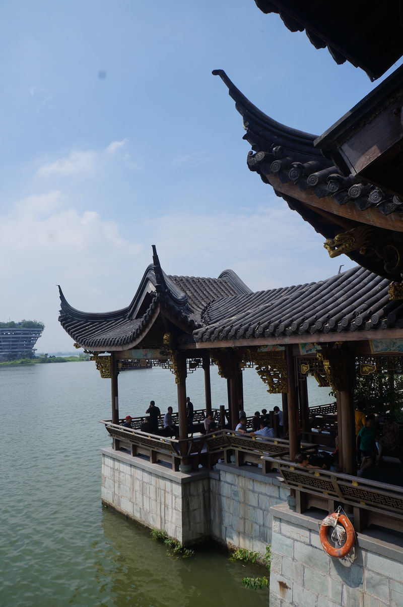 然后,我们乘画舫,荡漾湖中,参观了小镇全景,体验“船在江中走、如在画中游”的意境。凉风习习,湖水悠悠,远远望见两岸的塔楼廊桥,令人心情极佳。