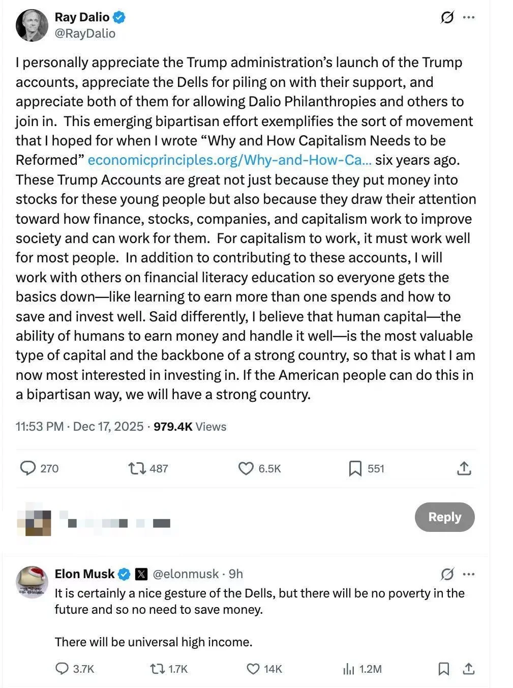 达利欧向“特朗普账户”捐款,马斯克却称“未来无需存钱”