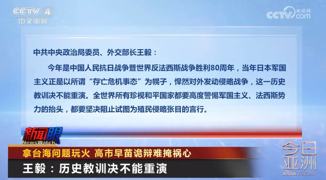 16日,中共中央政治局委员、外交部长王毅,在结束对阿联酋、沙特、约旦访问后,接受媒体采访时表示,今年是中国人民抗日战争暨世界反法西斯战争胜利80周年,当年日本军国主义正是以所谓“存亡危机事态”为幌子,悍然对外发动侵略战争,这一历史教训决不能重演。全世界所有珍视和平国家都要高度警惕军国主义、法西斯势力的抬头,都要坚决阻止试图为殖民侵略张目的言行。