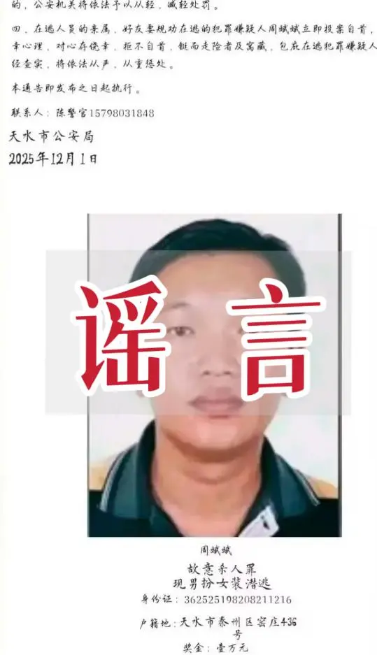 近日,有网民发布“麦积区苹果小镇学生被杀”“天水精神病杀人”“一男扮女装故意杀人犯流窜作案”等图文视频,引发网民关注,造成群众恐慌。