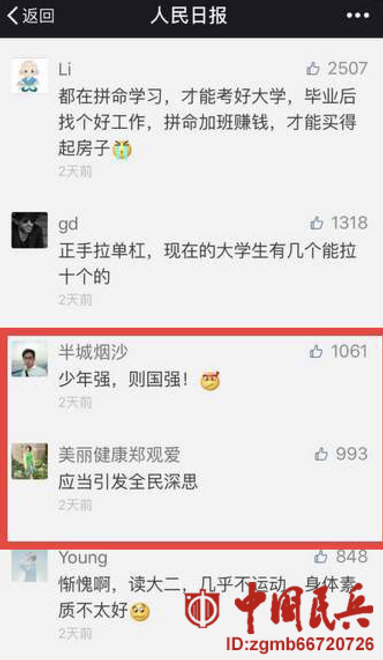 兵者,国之大事。网友们对应征青年体检现状的关切,反映出人们对青少年成长的关心和国防建设的关注。广大网友纷纷留言,表示青少年的身体健康应该引起高度重视并加以研究解决。也有部分网友提出疑问:应征青年体检不合格率如此高,新兵体格堪忧,军队战斗力何以保证?