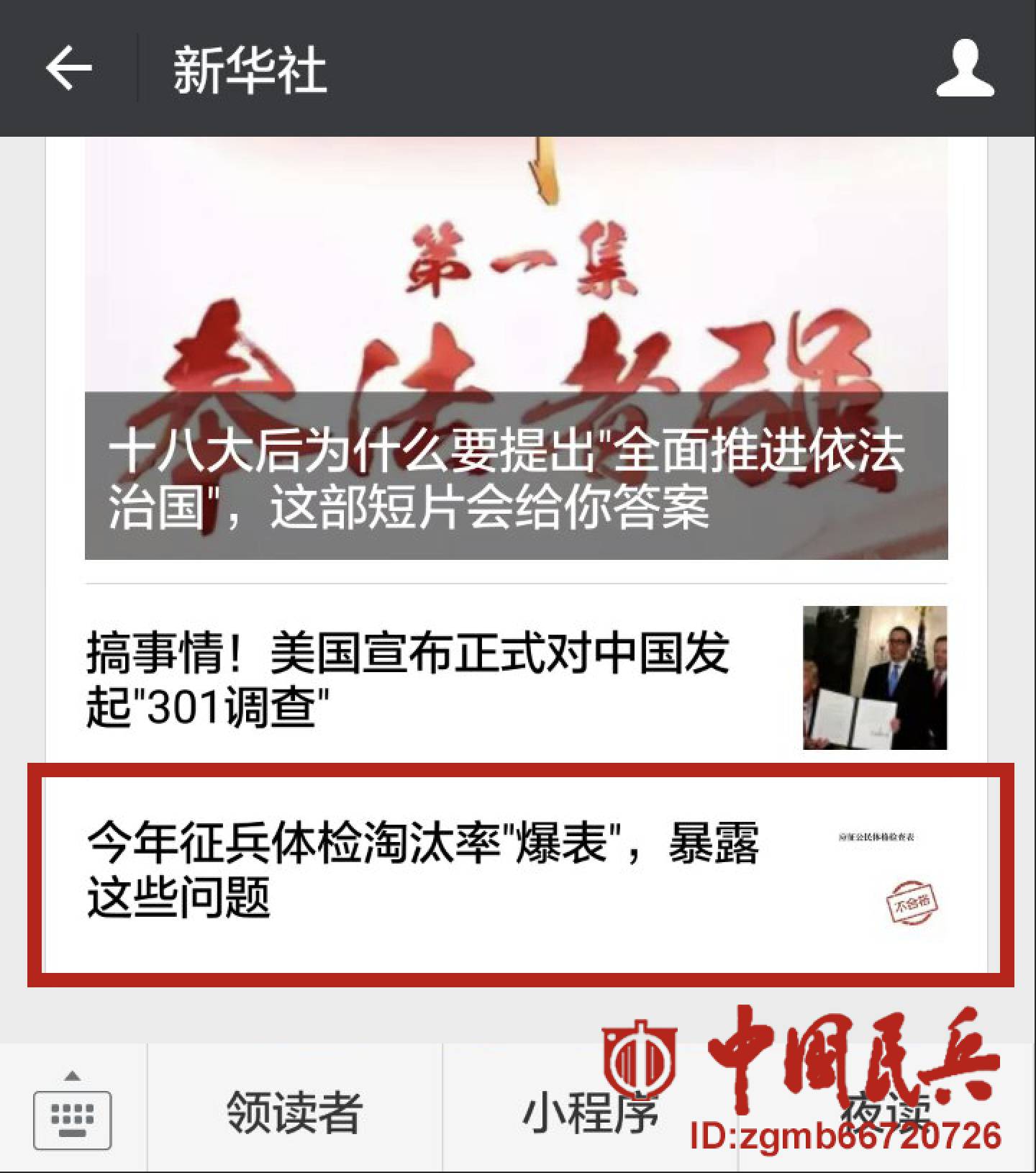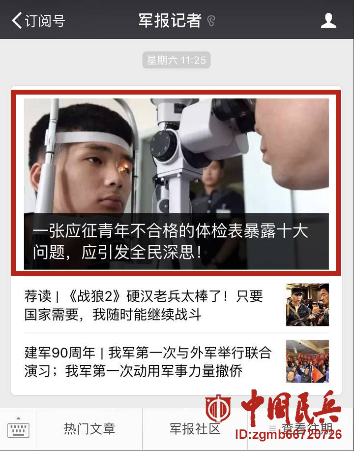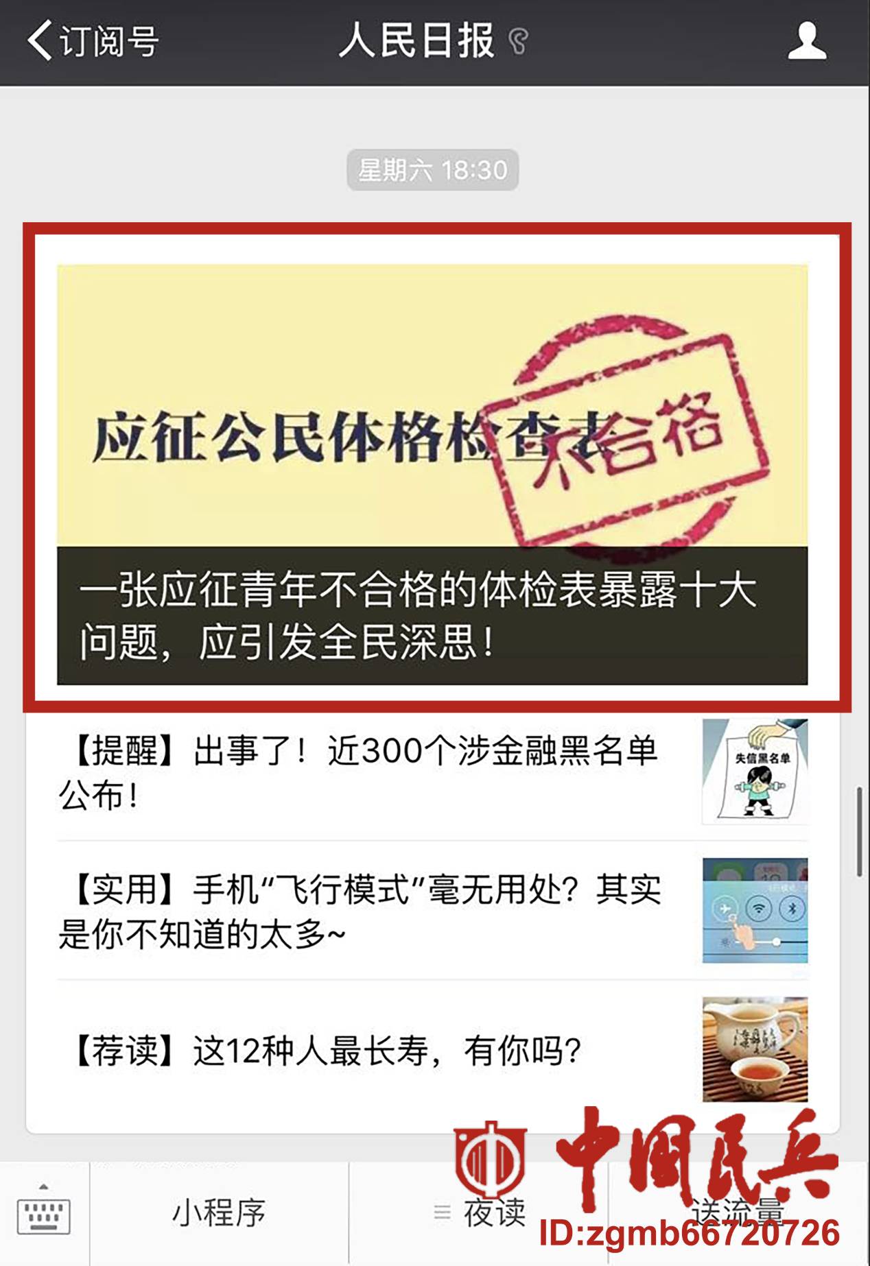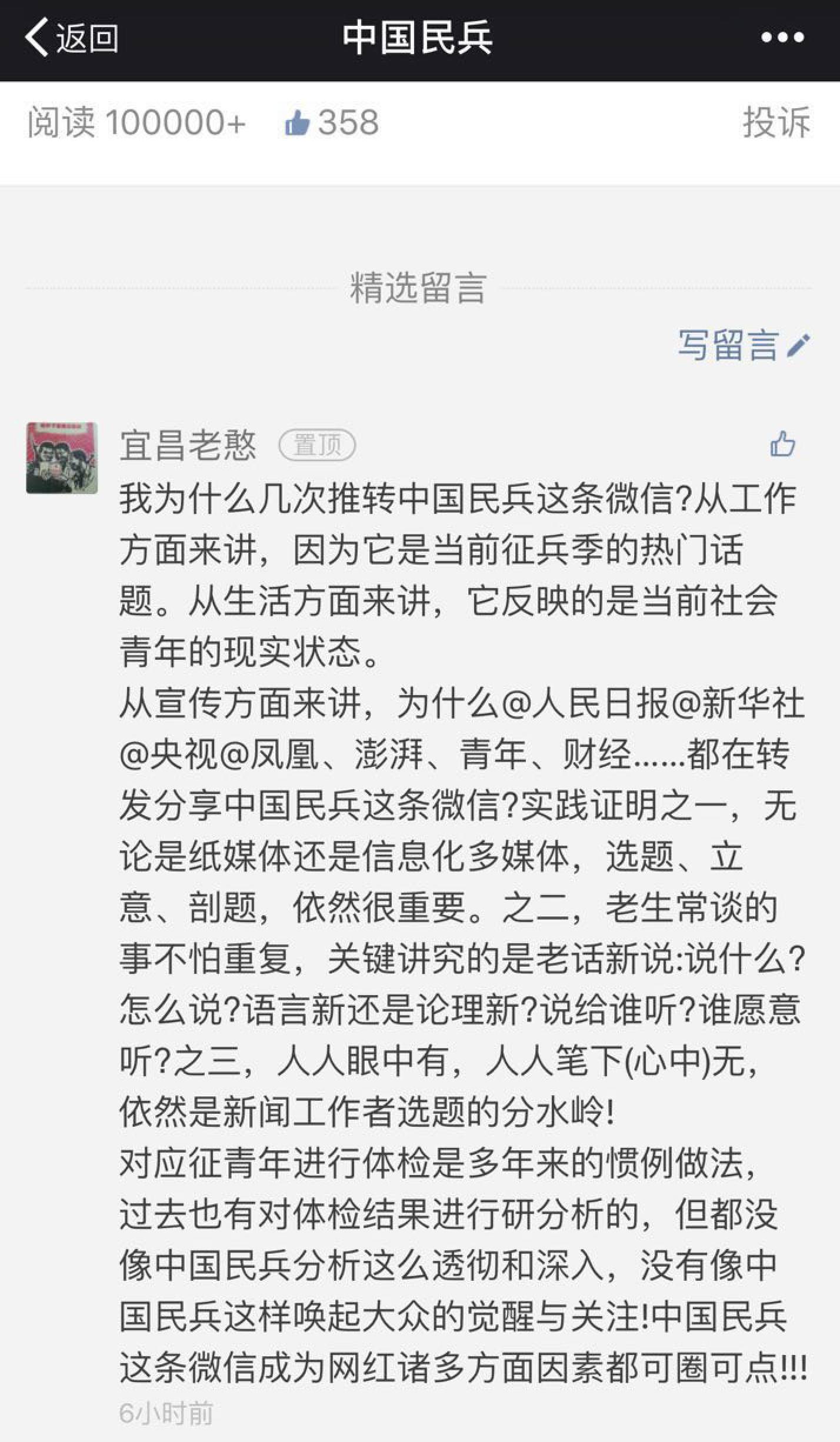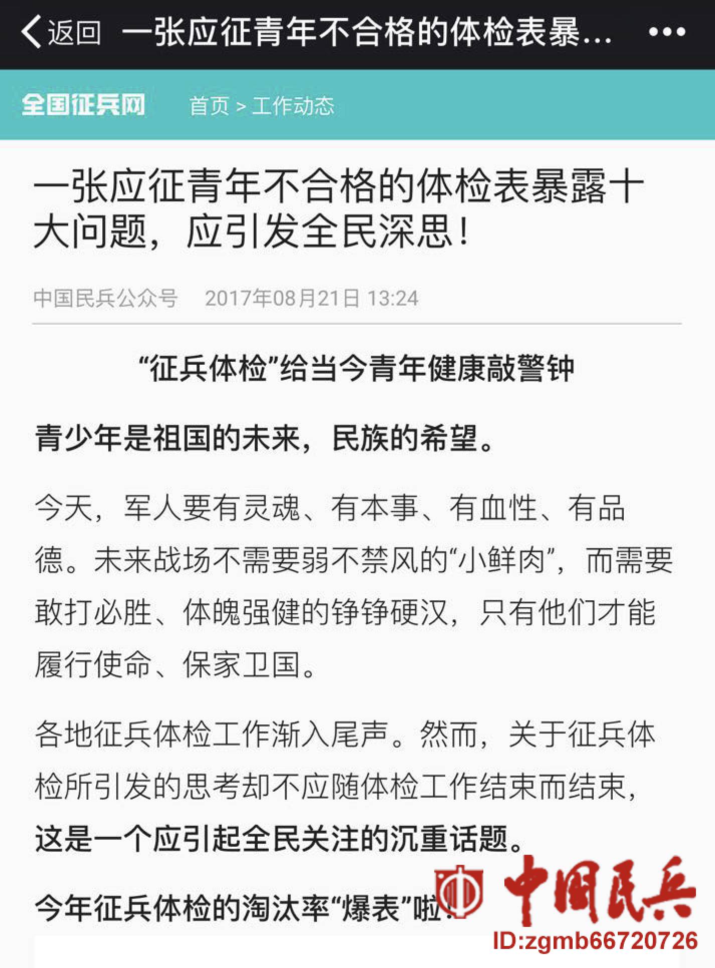 8月18日,“中国民兵”微信公众号首发了一篇引爆网络的文章——《一张应征青年不合格的体检表暴露十大问题,应引发全民深思!》。此文推出后立即引起全网转载,“人民日报”“新华社”“军报记者”“央视”等新媒体平台均进行了全文转发。